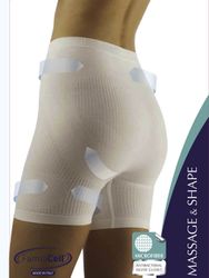 Шорты антицеллюлитные созданы из эксклюзивной запатентованной микроткани ячеистой структуры, характеризующейся маленькими выпуклостями, которая создает эффект постоянного массажа, эффективного при целлюлите, разглаживающего кожу, улучшающего кровообращение, помогающего избавиться от жировых отложений и скоплений токсинов. Специальные вставки подтягивают живот, бедра, ягодицы.