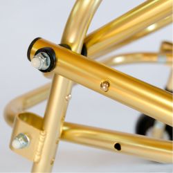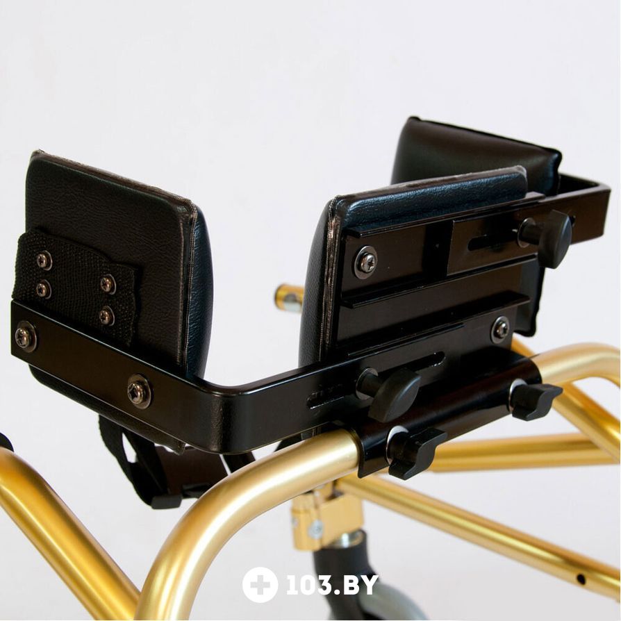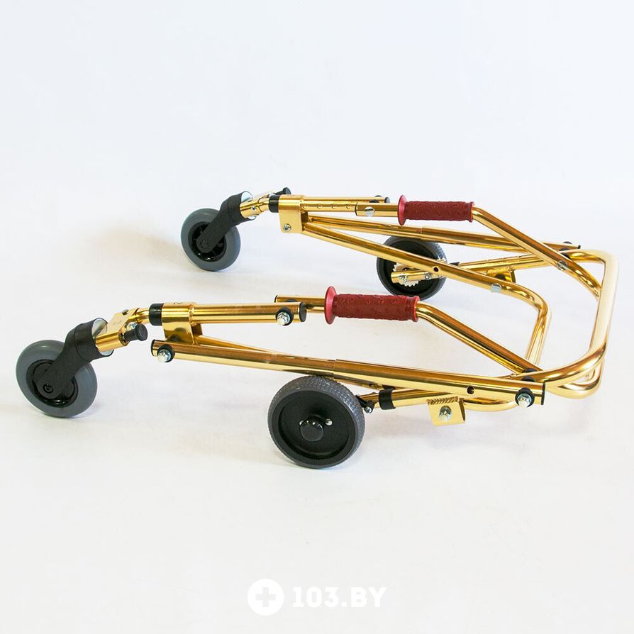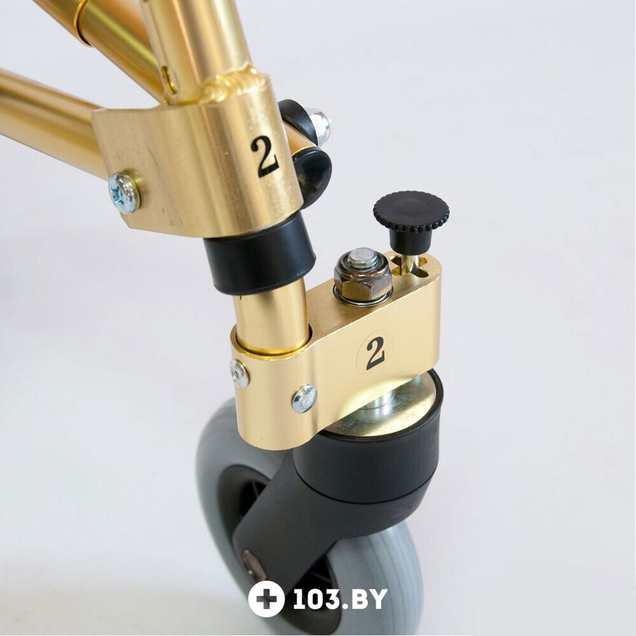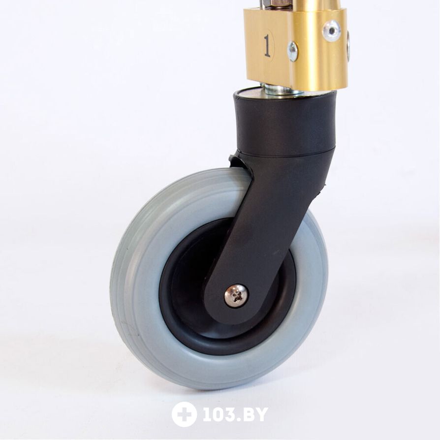 Колеса присутствуют на всех четырех опорах ходунков, что повышает их мобильность. Передняя пара оснащена фиксатором, блокирующим боковое поворачивание колес. В задних имеется храповый механизм, он предотвращает откат ходунков назад.