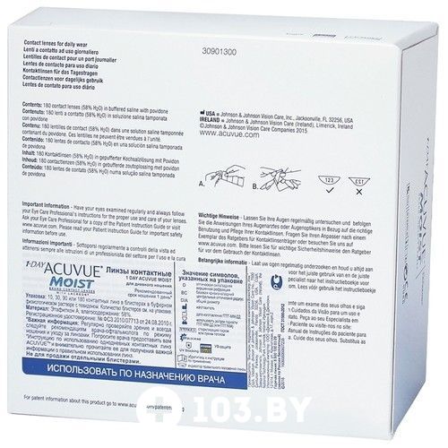 Реализация товара Контактные линзы 1-Day Moist (180 линз) Acuvue осуществляется только в стационарном торговом объекте по указанному адресу продавца. Информация о товарах и услугах на портале 103.by носит справочный характер и не является публичной офертой.