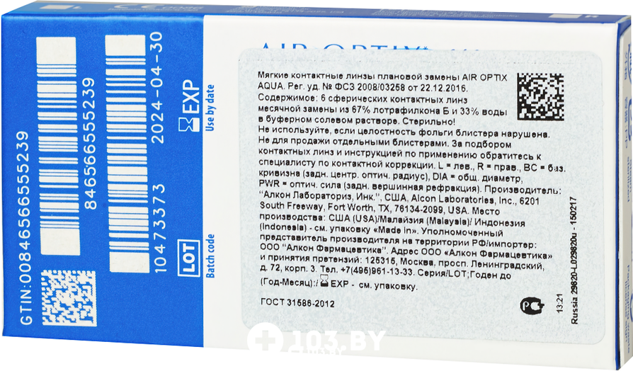 Реализация товара Контактные линзы Air Optix Aqua Alcon осуществляется только в стационарном торговом объекте по указанному адресу продавца. Информация о товарах и услугах на портале 103.by носит справочный характер и не является публичной офертой.