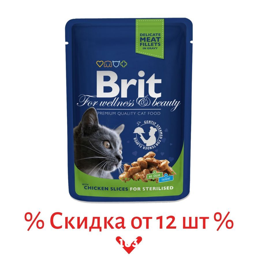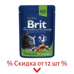 Brit Premium Cat Pouches Chicken Slices for Sterilised — влажный корм для кастрированных или стерилизованных животных, представленный в виде кусочков с курицей.