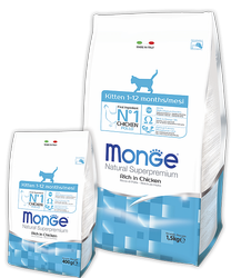 MONGE SUPERPREMIUM KITTEN - это полноценный сбалансированный рацион для котят обеспечивает высококачественное питание для здорового роста котят в возрасте от 1 до 12 месяцев. Рекомендуется для кормления беременных и кормящих кошек. Содержит важнейшие антиоксиданты, такие как витамин Е, для поддержки иммунной системы.