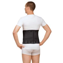 Изготовлен из неопрена, трехслойного эластичного материала, который обеспечивает согревающий эффект. Наличие шести ребер жесткости позволяет обеспечить высокие фиксирующие качества изделия при нестандартной фигуре (большой обхват талии). Крепится с помощью застежки-«контакт». Снабжен ребрами жесткости.