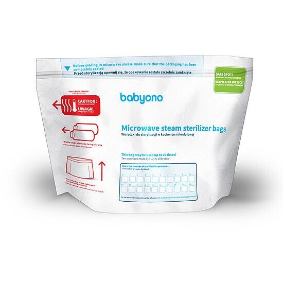Пакеты для стерилизации в микроволновой печи BabyOno — метод стерилизации детских бутылок и сосок. Нужно засунуть детские соски-бутылки в стерилизационном пакете в микроволновку. Через полторы минуты принадлежности уже стерильные. Пакеты изготовлены из медицинского полиэтилена, не содержат Бисфенол А и вредные пластификаторы.