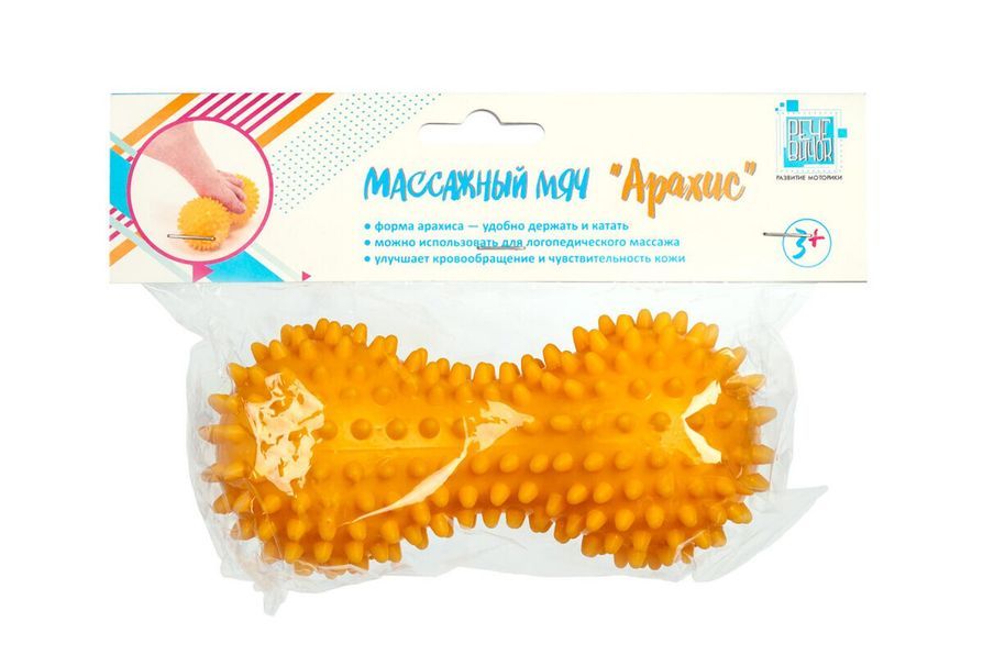 Интересная форма и яркий желтый цвет массажера привлекут внимание вашего ребенка – он с удовольствием будет сжимать его в ладошках и катать ногами по полу. Для лечебного массажа нужно перекатывать мяч по телу, изменяя степень нажима. «Арахис» помогает развивать моторику и речевые навыки ребенка.