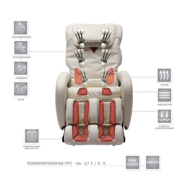 Вращающиеся массажные головки помогают расслабить мышцы позвоночника, а сочетание с вибромассажем и функцией прогрева, поможет улучшить циркуляцию крови. Создайте свой уголок комфорта, который предназначен только для вас. Автоматические программы, которые включают в себя комбинацию нескольких видов массажа. Кроме того, вы можете получить доступ к ручному управлению программами с помощью пульта дистанционного управления, который является очень прост и понятен в использовании.