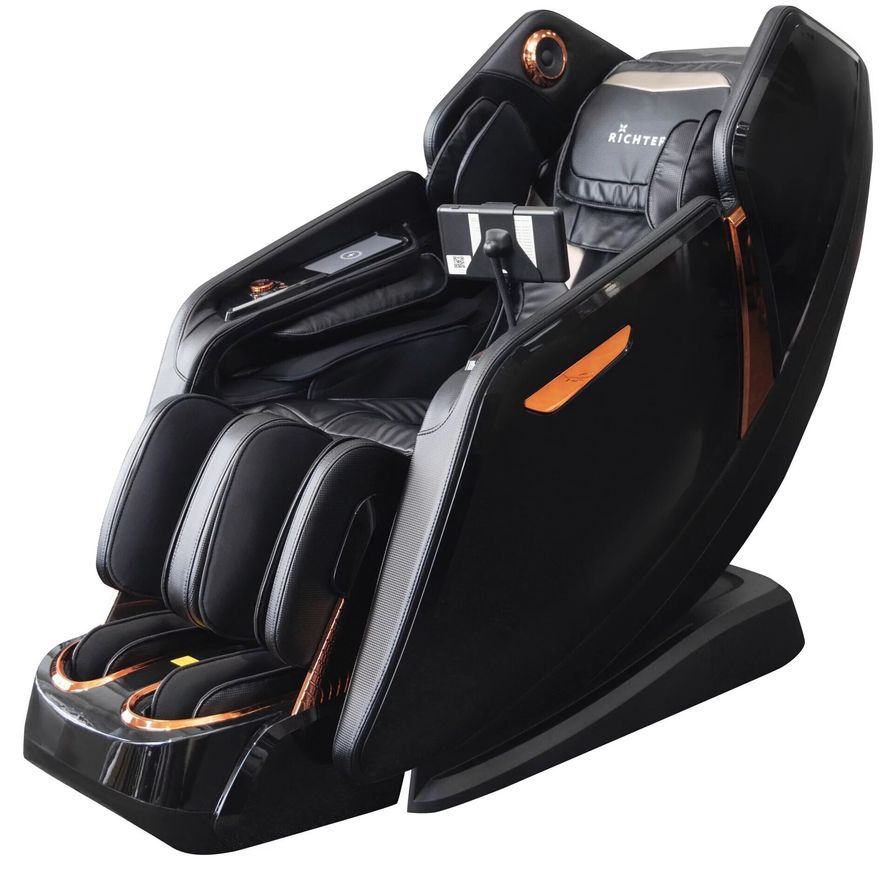 Массажное кресло Richter Royal оснащено удлиненной SL-кареткой с двойным массажным механизмом. 4D +3D = 7D двойная система позволяет одновременно массировать ваше тело от головы до бедер. В то время пока верхние массажные ролики прорабатывают зону от головы до середины спины и их выступ (глубину массажа) можно регулировать до 5 значений прямо в автопрограмме, нижний механизм воздействует на область от поясницы до бедер.