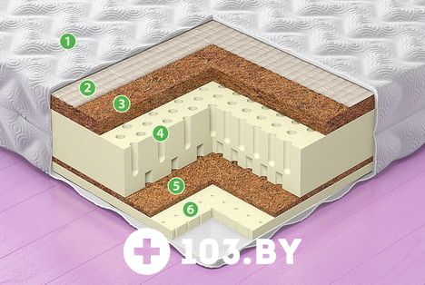 3 - Кокосовая плита. Натуральный наполнитель из спрессованных кокосовых волокон, скрепленных пропиткой на основе натурального латекса. Придает жесткость матрасу и делает его более упругим.