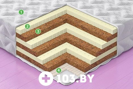 3 - Кокосовая плита. Натуральный наполнитель из спрессованных кокосовых волокон, скрепленных пропиткой на основе натурального латекса. Придает жесткость матрасу и делает его более упругим.