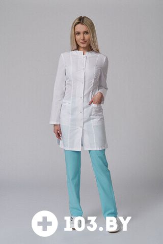 Халат женский укороченный полу прилегающего силуэта с центральной застежкой на 6 кнопок и разрезами в боковых швах.