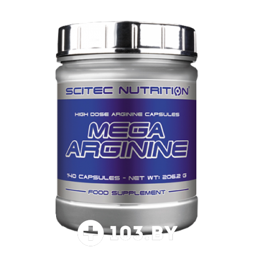 Mega Arginine (140 капс), Scitec Nutrition – это чистый аргинин в капсулах. В одной капсуле препарата содержится целых 1300 мг активного вещества. Помогает хорошо в наращивании мышечных волокон и при сушке помогает дополнительно тратить калории на тренировке. Так же способствует синтезу окиси азота организмом, что в свою очередь позволяет максимально наполнить ткани мышц питательными веществами и кислородом для лучшей их работы.