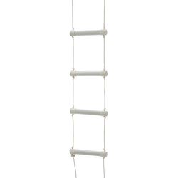 Лестница изготовлена из перекладин из несгибаемого пластика, связанных прочной веревкой. Изделие крепится к торцевой спинке кровати с помощью металлических крючков.