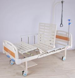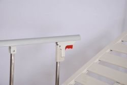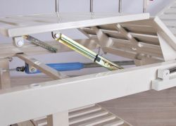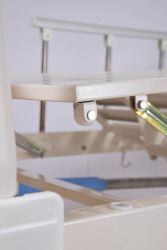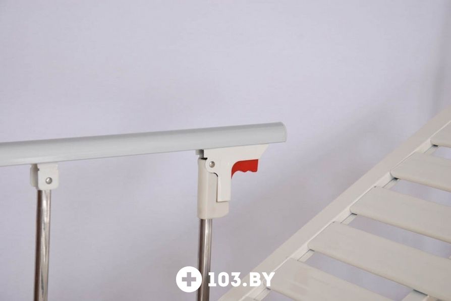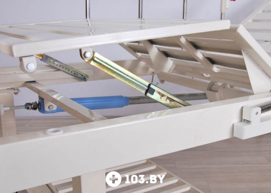 Кровать - 4-х секционная, снабжена червячным механическим приводом регулировки угла наклона спинной секции и угла наклона ножной секции. Основание кровати выполнено из стали, покрыто ударопрочной эпоксидной эмалью. Механизмы регулировки наклонов секций ложа кровати оборудованы складными рукоятками. В сложенном состоянии рукоятки приводов не выступают за торцевое ограждение кровати Боковые ограждения (2шт) выполнены из алюминия и легко опускаются, обеспечивая быстрый доступ к пациенту. Несущие колеса кровати изготовлены из высокопрочной стали, что обеспечивает их долговечность, колеса также оснащены индивидуальными тормозами.