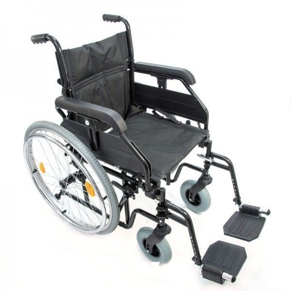 Стальная, ширина сиденья 41, 43, 46, 48 см., нагрузка до 130 кг. Вес 20 кг. Откидные и съемные подлокотники. Съемные подножки. Складная спинка. Ремень безопасности. Быстросъемные передние и задние колеса.