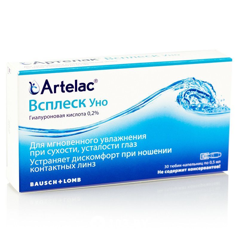 Артелак Всплеск Уно – это увлажняющие капли для глаз. В состав этого средства входит натуральный полимер гиалоурановая кислота. Купить его рекомендуют людям, страдающим от сухости глаз.