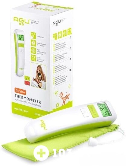 Бесконтактный термометр AGU измеряет температуру, не касаясь ребенка. Требуется 1 секунда для проведения измерения с точностью ± 0,2 ºC. Прибор сигнализирует об окончании измерения, особый сигнал подается в случае, если температура выше нормы. При помощи прибора можно измерять также температуру поверхностей и жидкостей.
