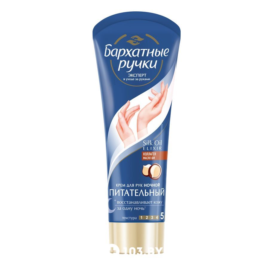 Реализация товара Ночной крем для рук, восстанавливающий, 80 мл Бархатные ручки осуществляется только в стационарном торговом объекте по указанному адресу продавца. Информация о товарах и услугах на портале 103.by носит справочный характер и не является публичной офертой.