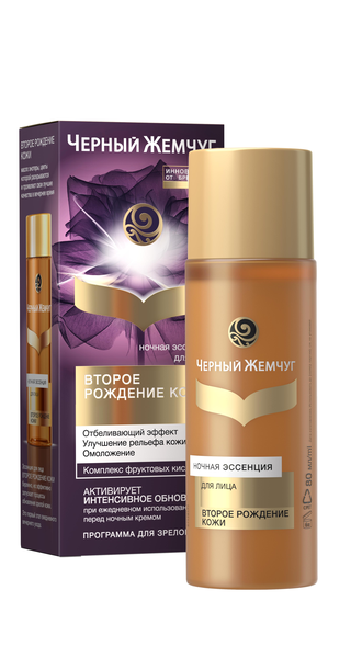 Вдохновленный красотой распускающегося только ночью цветка энотеры бренд Черный Жемчуг создает программу обновления для зрелой кожи. Ведь зрелой коже недостаточно просто ухода, ей необходимо интенсивное обновление. Эссенция для лица Второе рождение кожи с комплексом фруктовых кислот: лимонной, яблочной и гликолевой, мягко, но эффективно освобождает кожу от ороговевших частиц, улучшает обмен веществ в клетках кожи, способствует увеличению доли молодых клеток в эпидермисе, улучшая состояние кожи, ее цвет и рельеф, омолаживая день за днем. Эссенция c эффектом мягкого пилинга подходит для курсового применения (1 месяц). Не требует смывания. Эффективность доказана даже для кожи старше 60 лет: 100% интенсивное обновление кожи, 96% морщин становится меньше, 95% пигментные пятна менее выражены. Принцип действия программы второе рождение кожи – это направленное стимулирование обновления зрелой кожи средствами для ночного ухода Второе рождение кожи – ночным кремом и эссенцией с эффектом мягкого пилинга, а также интенсивное питание, увлажнение и надежная защита от факторов старения с помощью UV-фильтров днем для закрепления результата омоложения кожи. Для значительного омоложения кожи уже через 4 недели, используйте ежедневно все средства программы ухода для зрелой кожи Второе рождение кожи – эссенцию с эффектом мягкого пилинга перед ночным кремом для усиления эффекта обновления кожи в течение ночи, ночной крем для запуска процесса интенсивного омоложения и дневной крем для лица с SPF 15 для защиты результата.