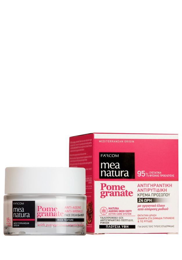 Крем против морщин FARCOM Mea Natura с маслом граната 50 мл омолаживающий 24-х часовой крем для лица интенсивного действия, против морщин и признаков старения кожи. Содержит органическое масло гранатовой косточки, известное своими омолаживающими и антиоксидантными свойствами, насыщен ингредиентами анти-старения и компонентами, предотвращающими появление и разглаживающими морщины. Защищает от воздействия свободных радикалов и вредных внешних факторов, которые активизируют процесс старения кожи, интенсивно увлажняет и питает кожу, оставляя ее обновленной, гладкой, здоровой и яркой. Рекомендованный возраст использования крема: 30, 35, 40, 45 лет.