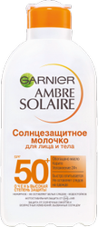 Солнцезащитное молочко для лица и тела SPF 50+ с карите. Очень высокая степень защиты для светлой, чувствительной к солнечным лучам кожи, защита от UVA- и UVB-лучей. Инновационная формула классического молочка средств Garnier Ambre Solaire содержит масло Карите, быстро впитывается, увлажняет 24 часа.