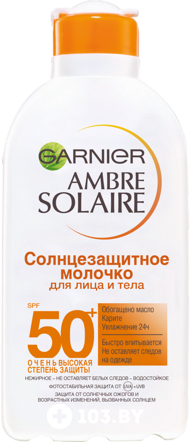 Солнцезащитное молочко для лица и тела SPF 50+ с карите. Очень высокая степень защиты для светлой, чувствительной к солнечным лучам кожи, защита от UVA- и UVB-лучей. Инновационная формула классического молочка средств Garnier Ambre Solaire содержит масло Карите, быстро впитывается, увлажняет 24 часа.