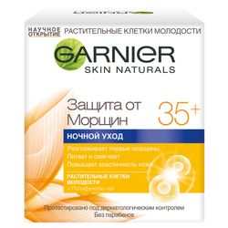 Специальный комплекс от Garnier Защита от морщин 35+ "Растительные клетки молодости + Полифенолы чая" действуют на кожу в 2-х направлениях. Разглаживает кожу, сокращает первые морщины и питает. Каждой ночью Ваша кожа насыщается необходимыми питательными элементами, становится более упругой и выглядит отдохнувшей утром.