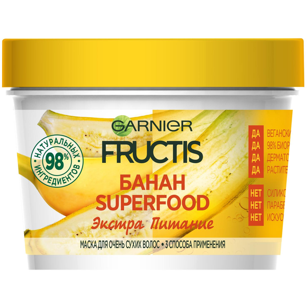 Указанная цена на Маска для очень сухих волос Банан Фруктис Superfood Экстра Питание 390 мл Garnier может отличаться от фактической. Если в описании или цене вы заметили неточность или ошибку, пожалуйста, сообщите нам на почту help@103.by.