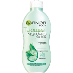 Тающее молочко для тела с уникальным сочетанием активных компонентов - Бифидокомплекса и Алоэ Вера - защищает и интенсивно увлажняет кожу. Ежедневное негативное воздействие окружающей среды (горячая вода, сухой воздух, трение одежды) приводит кожу тела к быстрой потере влаги, даже если Вы не ощущаете этого, либо, напротив, чувствуете дискомфорт и сухость, даже если увлажняете кожу каждый день. Потеря влаги может привести к ухудшению внешнего вида кожи, её преждевременному старению. Тающее молочко для тела Гарньер Природная Забота увлажняет кожу настолько интенсивно, что даже при прикращении его использования, Вы ощущаете увлажнённость кожи до 7 дней. Формула молочка содержит Бифидокомплекс, созданный по аналогии с пробиотиками йогурта и способный оптимизировать естественный водный баланс кожи. Экстракт Алоэ Вера, известный своими питательными и успокаивающими свойствами, увлажняет и смягчает кожу, возвращая ей красоту и ощущение комфорта.