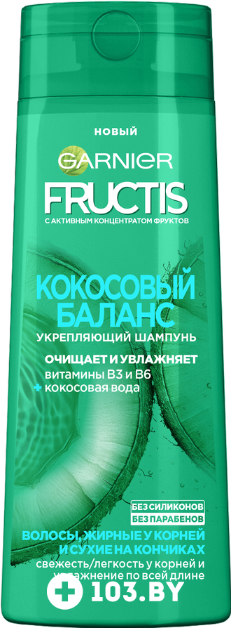 Уникальная формула шампуня для волос Фруктис Кокосовый Баланс без силиконов, обогащенная кокосовой водой и витаминами В3 и В6, очищает у корней и увлажняет до самых кончиков. Волосы мягкие и гладкие. Результат: свежие у корней и увлаженные волосы по всей длине. Новая формула FRUCTIS не содержит парабенов и обогащена активным концентратом фруктов. Благодаря комбинации фруктов, витаминов В3, В6 и протеина лимона ваши волосы более сильные и блестящие.
