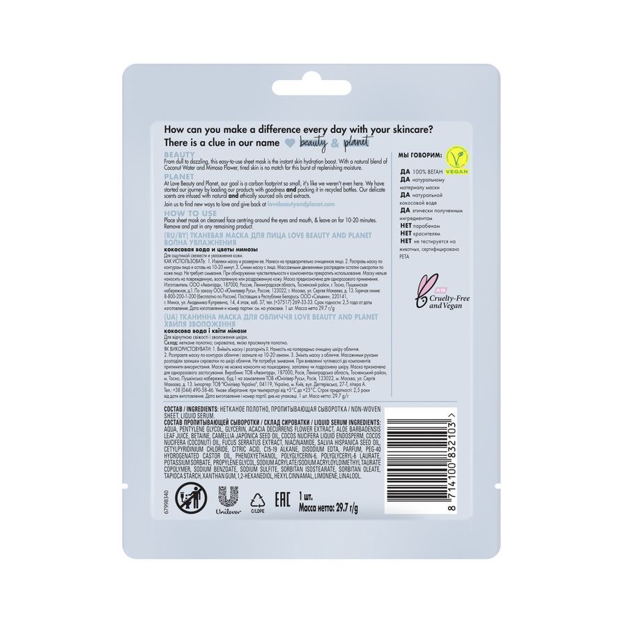 Тканевые маски для лица Love Beauty and Planet – это натуральные ингредиенты без парабенов и красителей. Материал маски сделан из натуральных волокон, которые и мягки для кожи, и не опасны для планеты. Продукты бренда веганские и не тестируются на животных, имеют подтверждающие сертификаты от PETA и VEGAN.