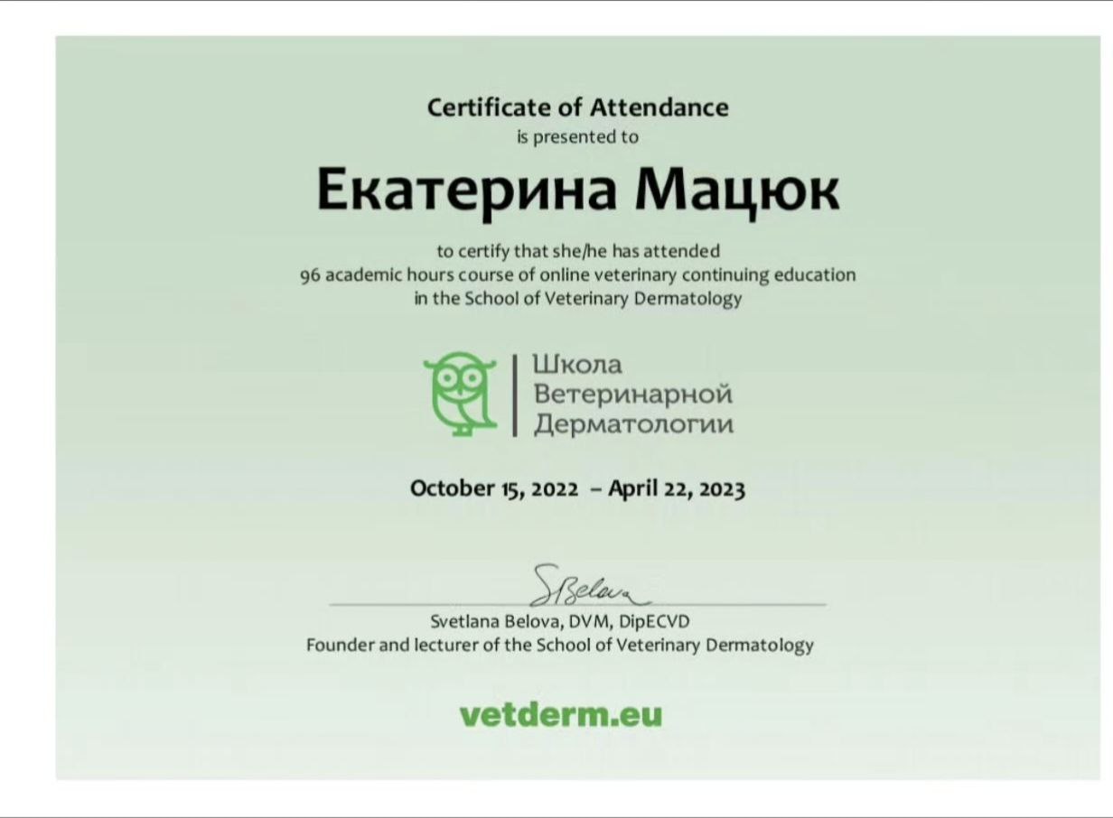 — 2022—2023 гг. — Школа ветеринарной дерматологии Светланы Беловой, 96 академических часов