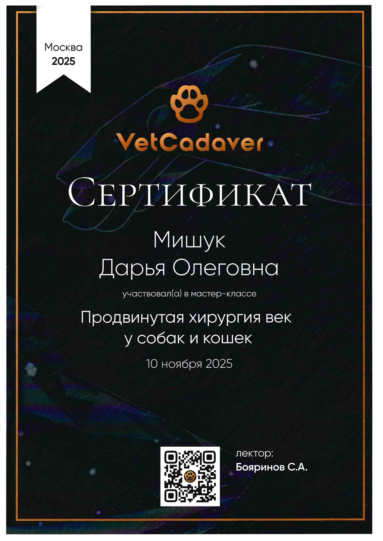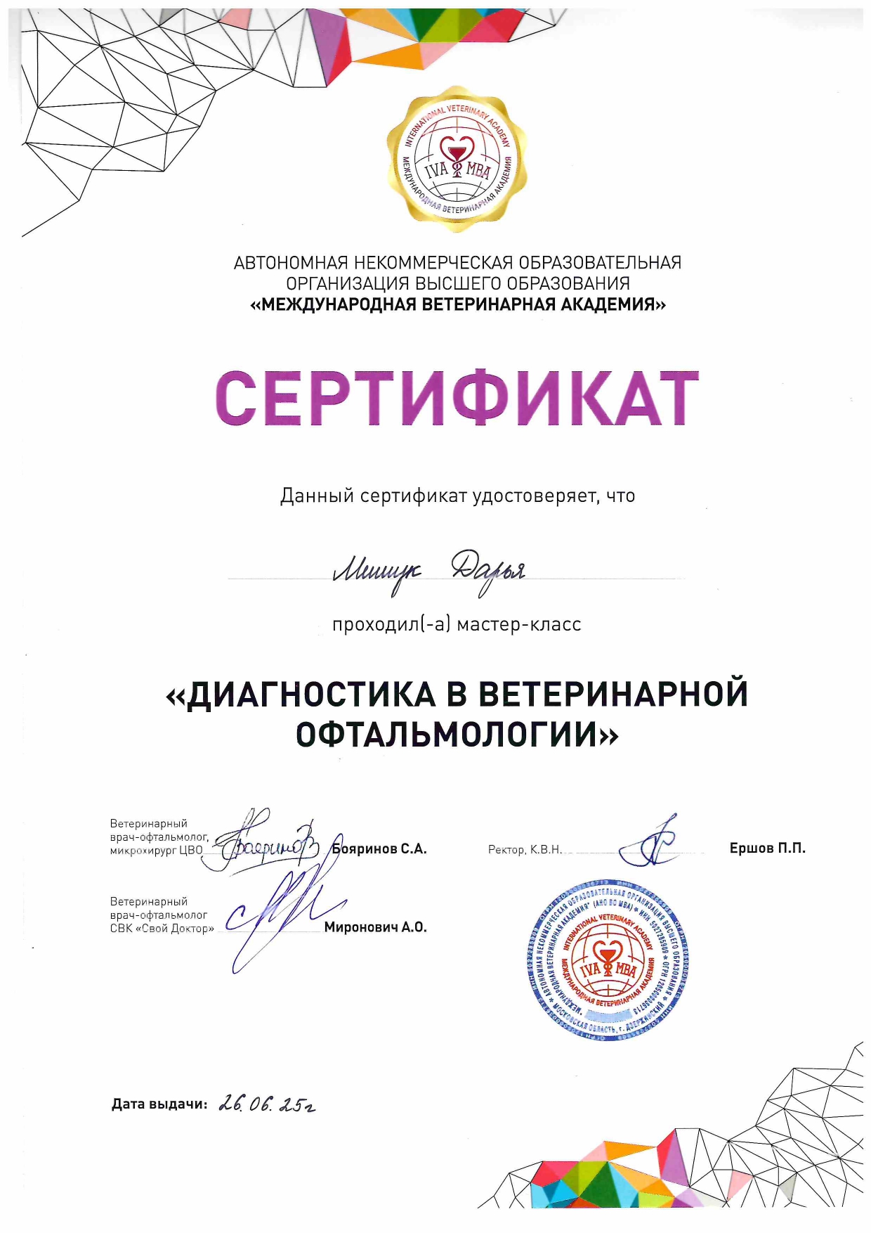 • 2022 г. — окончила Витебскую государственную академию ветеринарной медицины