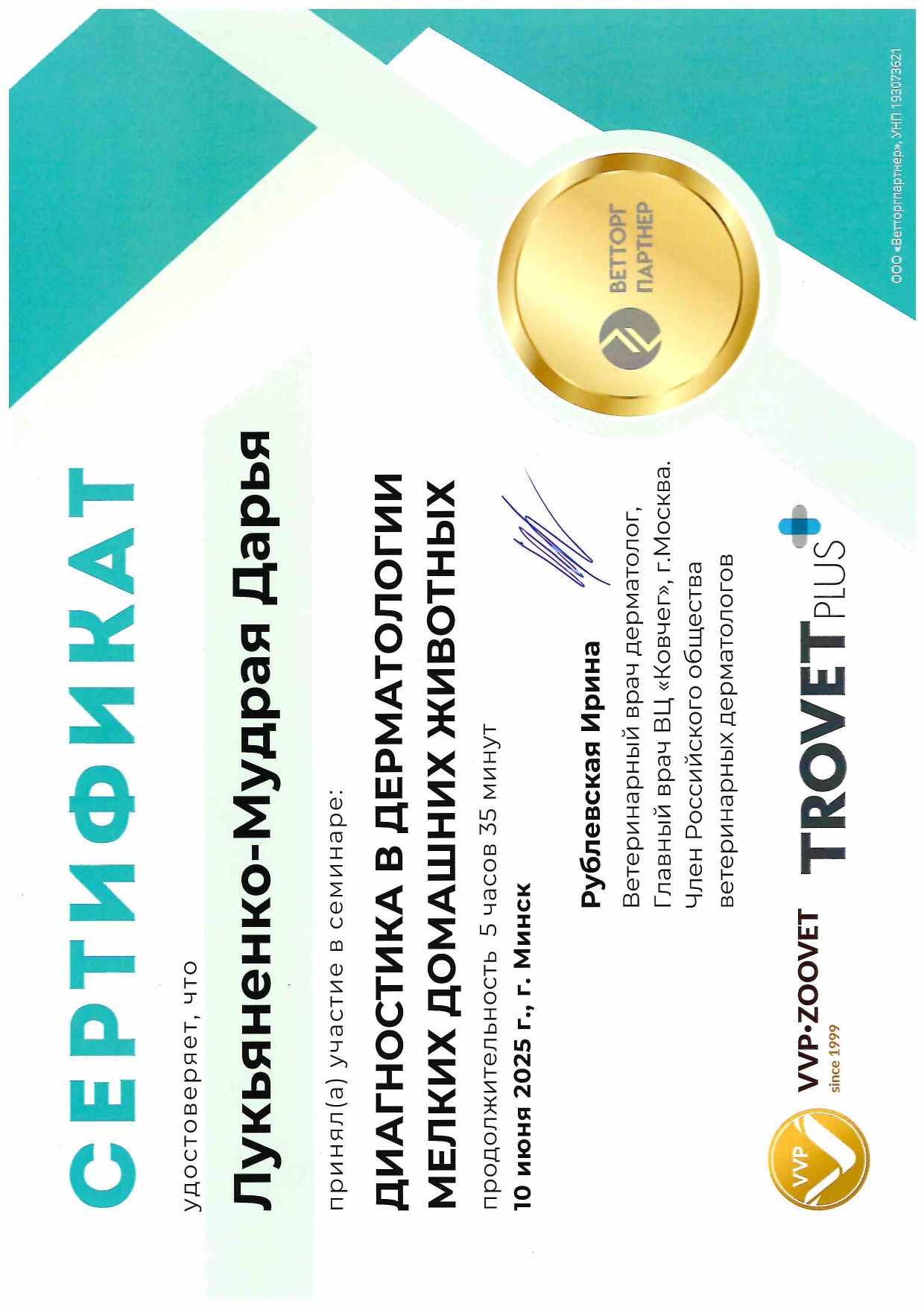 • Является регулярным участником ветеринарных конференций, курсов повышения квалификации и мастер-классов в Беларуси и за рубежом