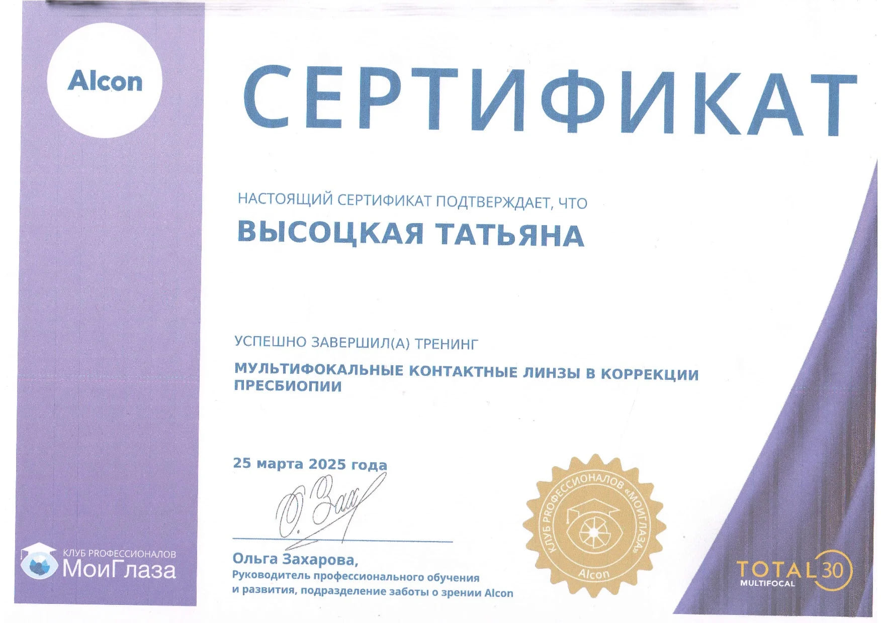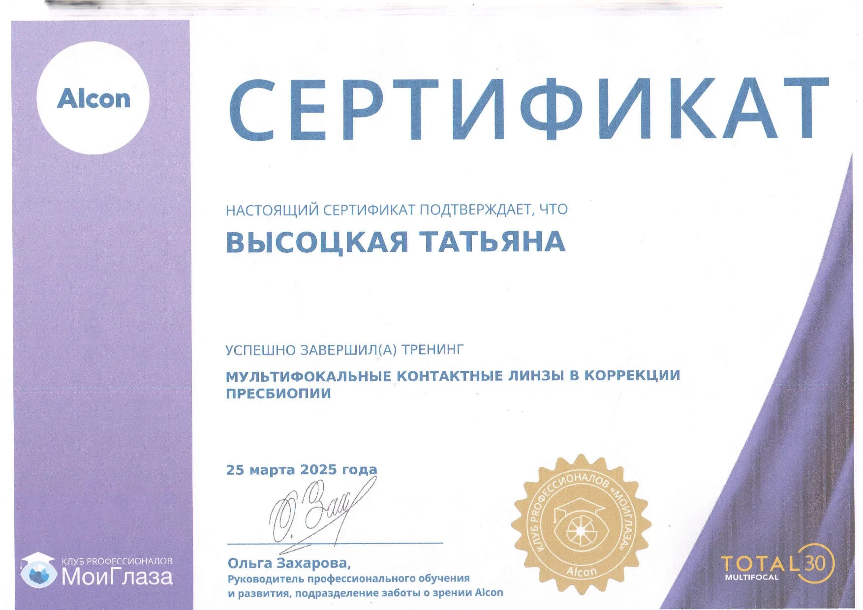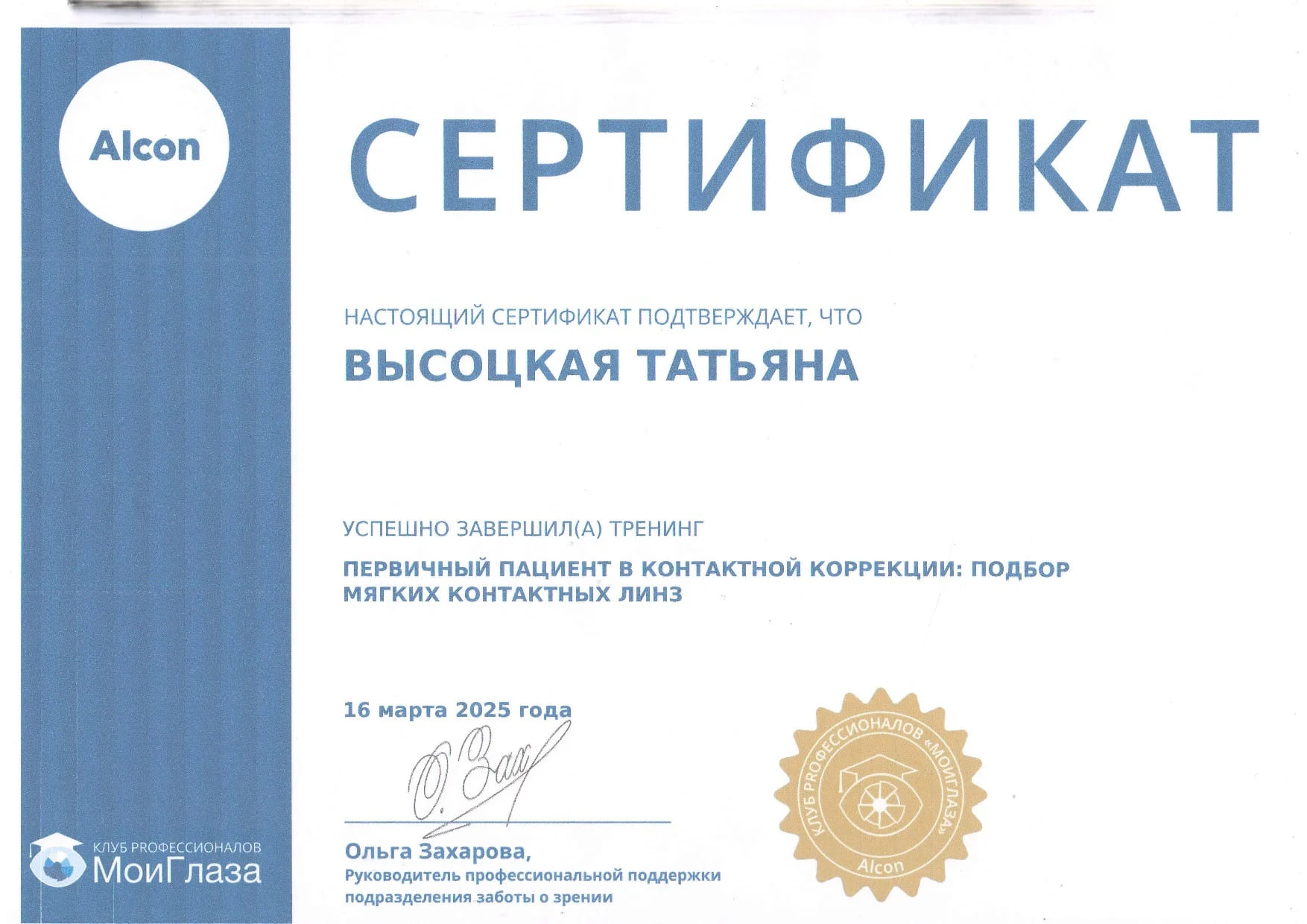• 2025 г. — Завершила тренинг «Мультифокальные контактные линзы в коррекции пресбиопии».
