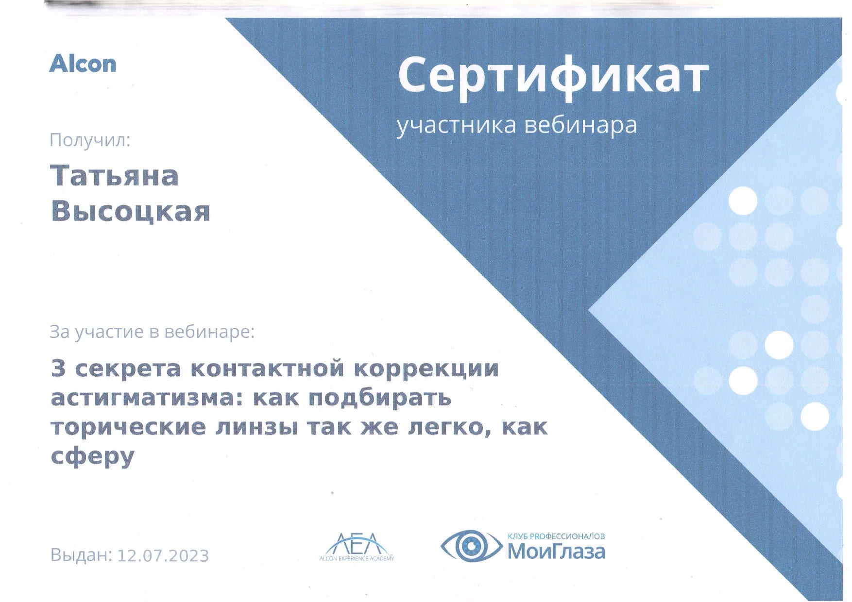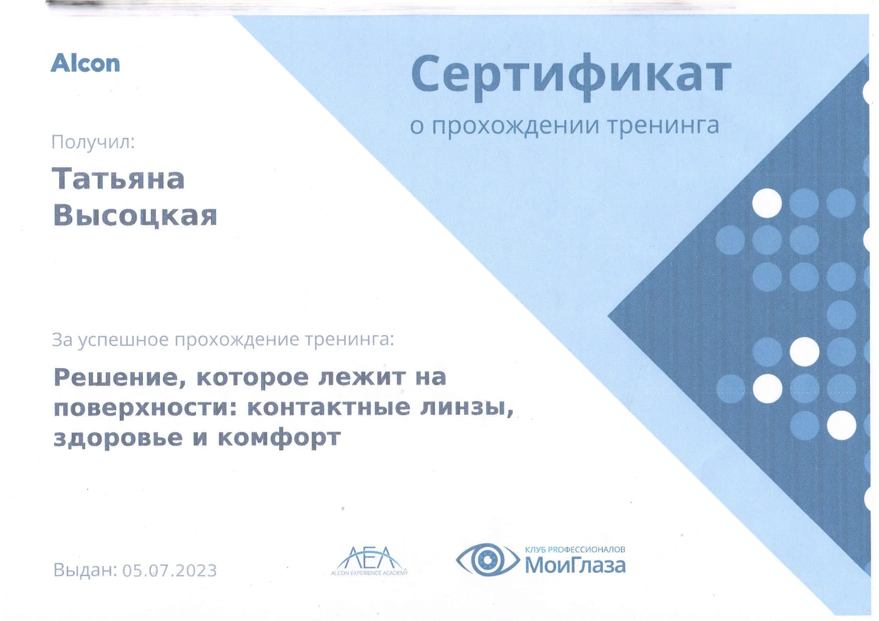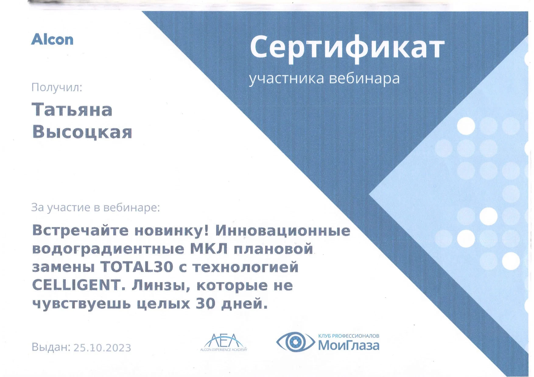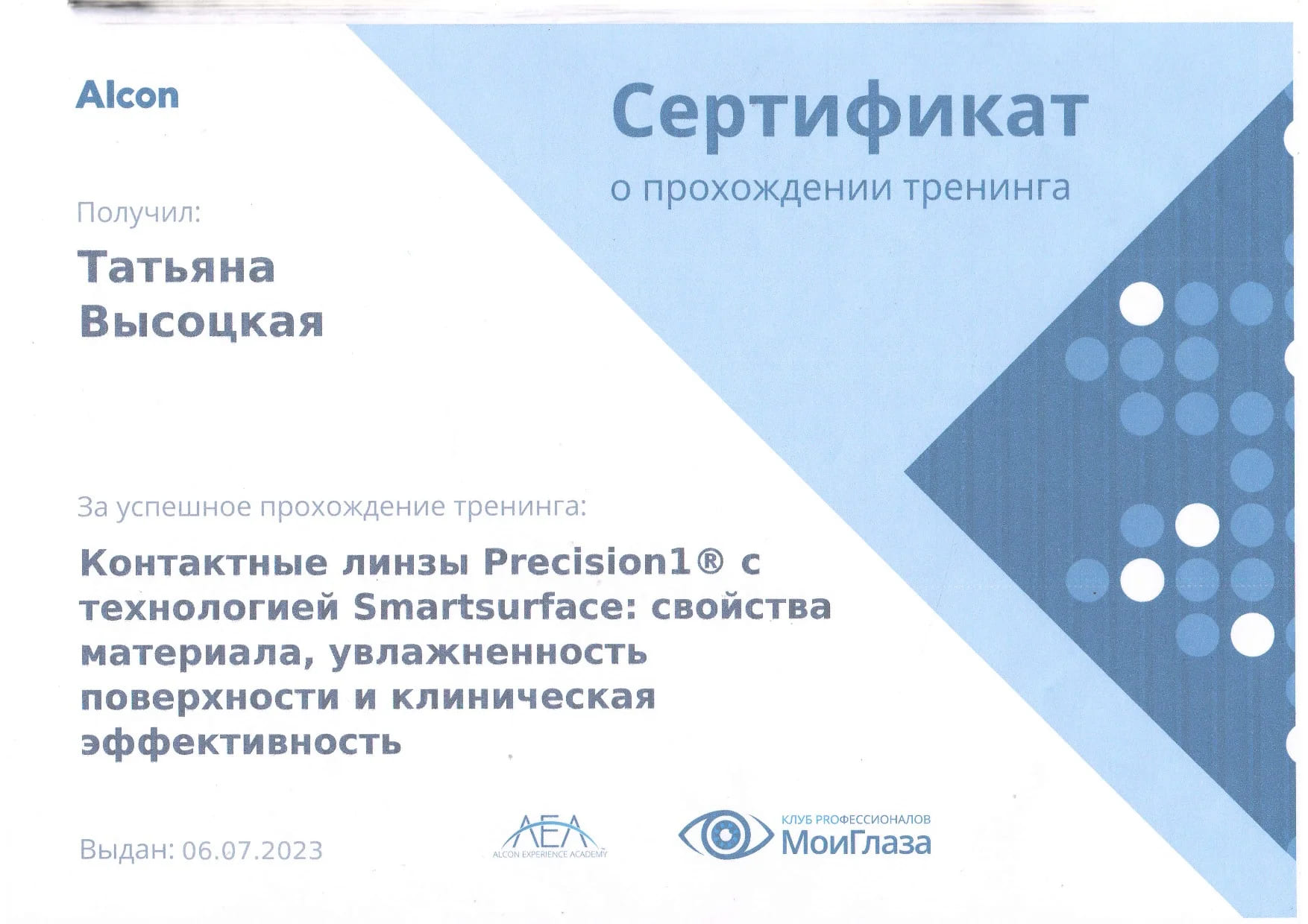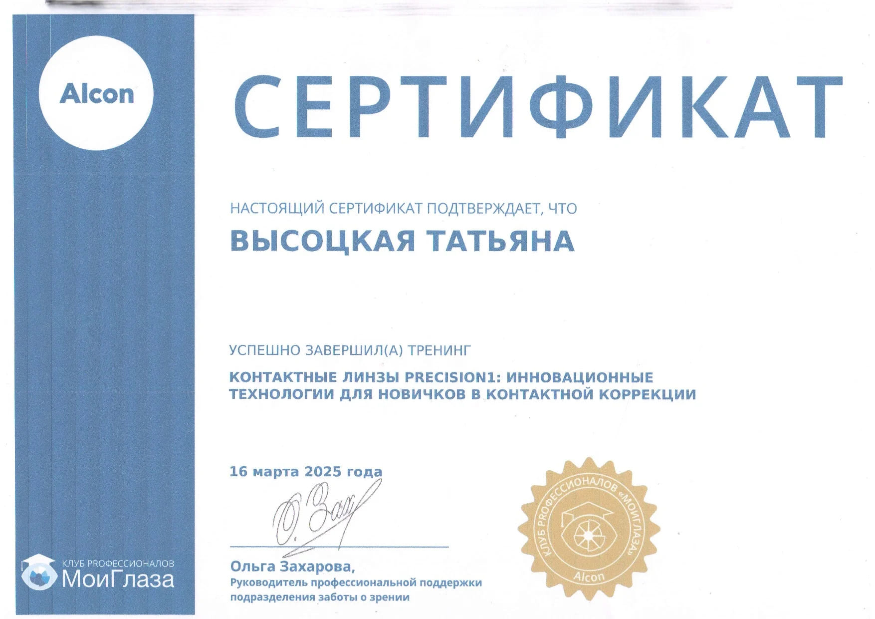 • 2025 г. — Завершила тренинг «Контактные линзы PRECISION1: инновационные технологии для новичков в контактной коррекции».