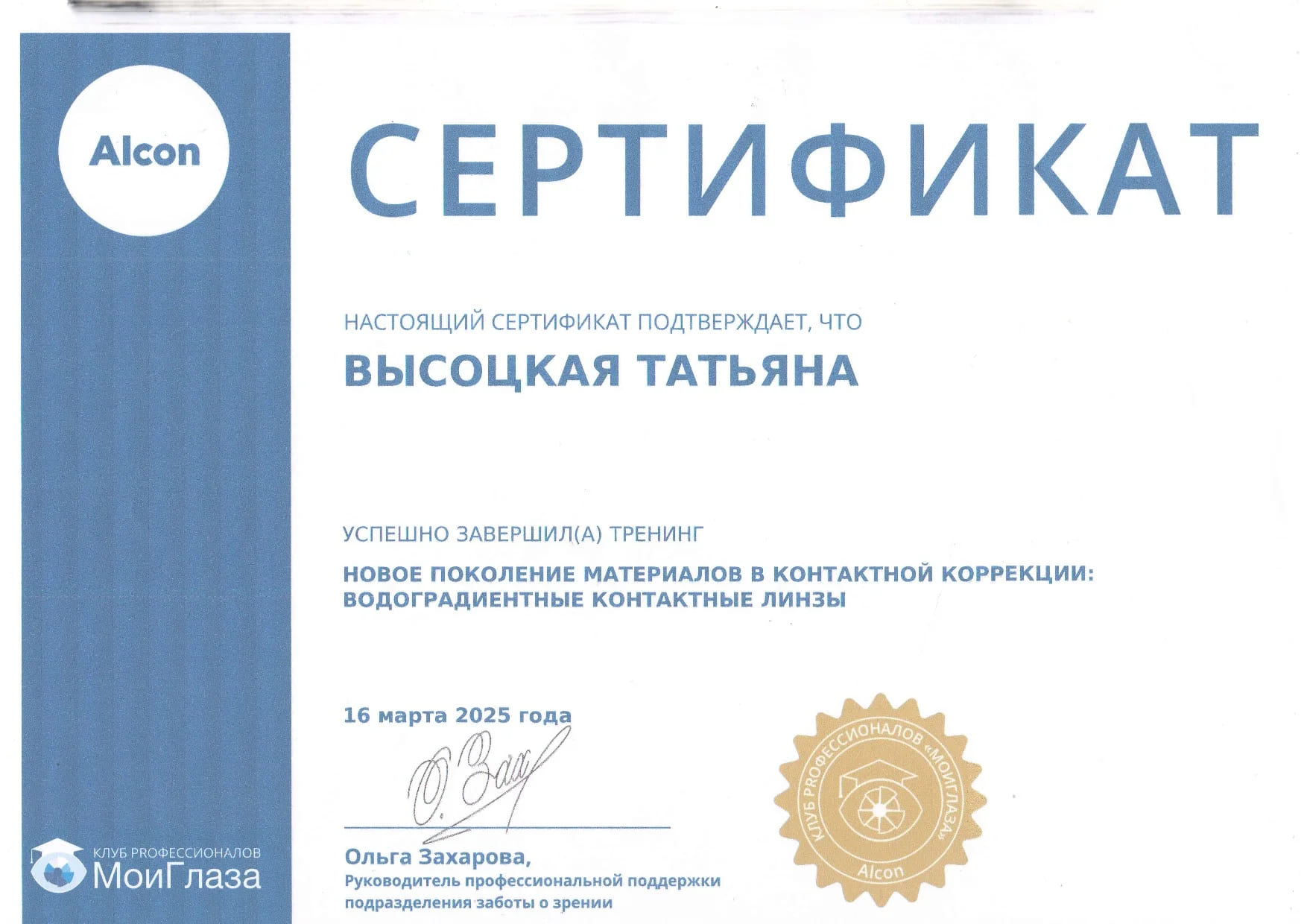 • 2025 г. — Завершила тренинг «Новое поколение материалов в контактной коррекции: водоградиентные контактные линзы».