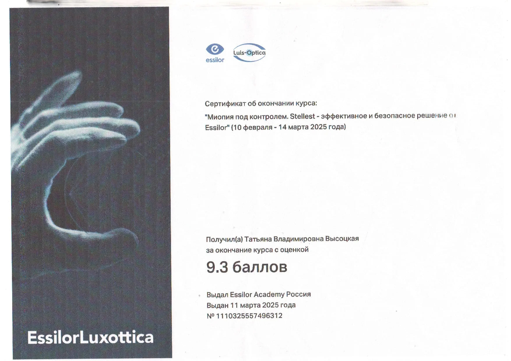 • 2025 г. — Окончила курс «Миопия под контролем. Steilest — эффективное и безопасное решение Essilor».