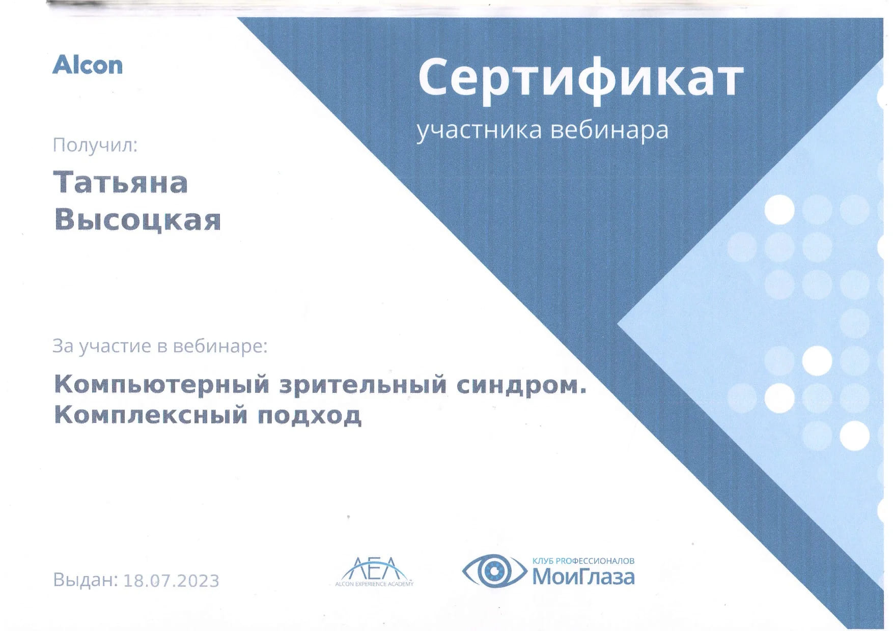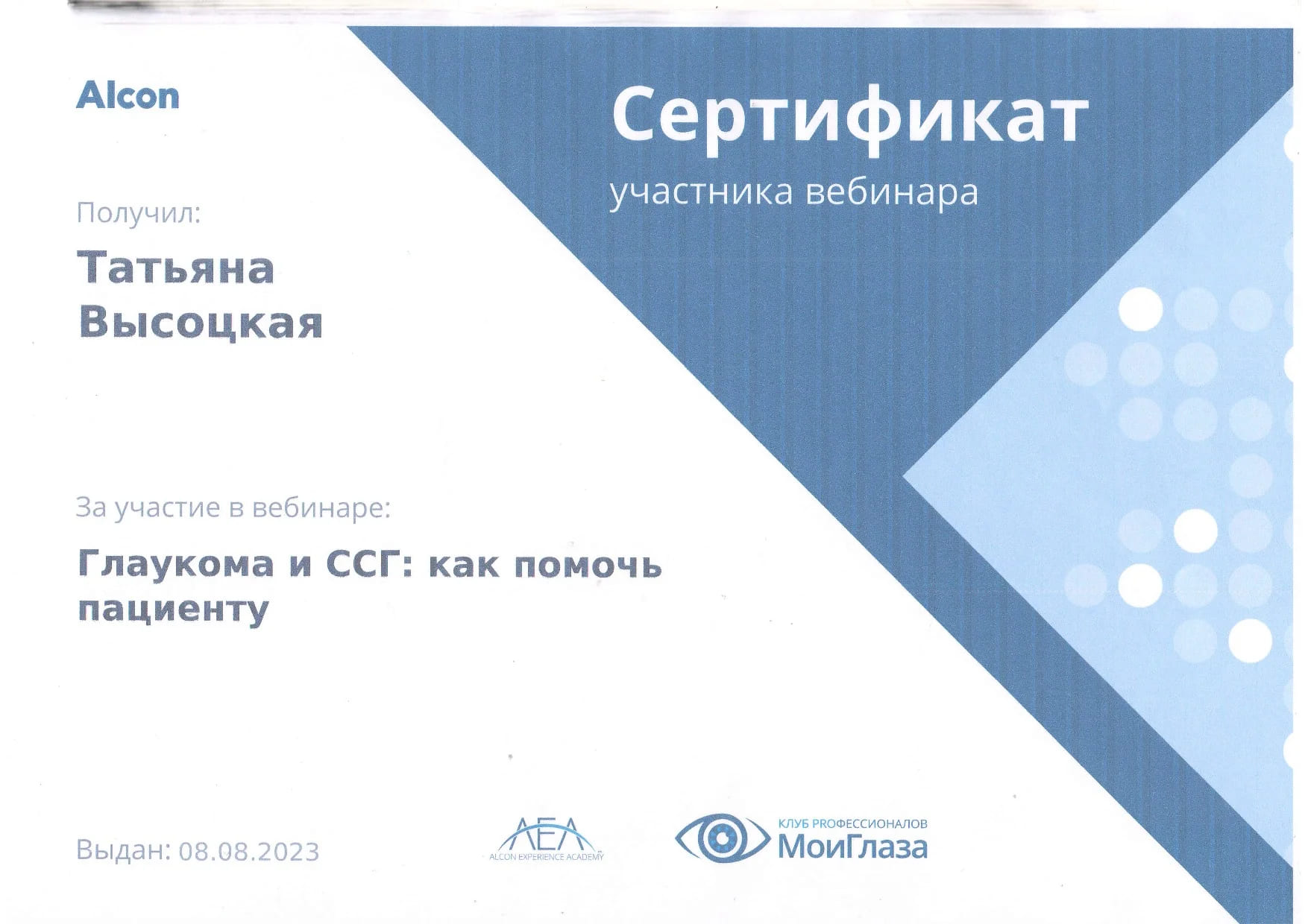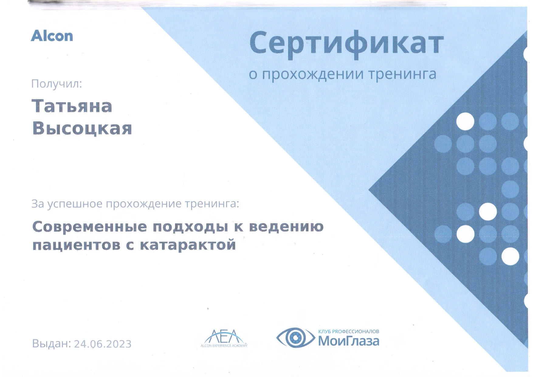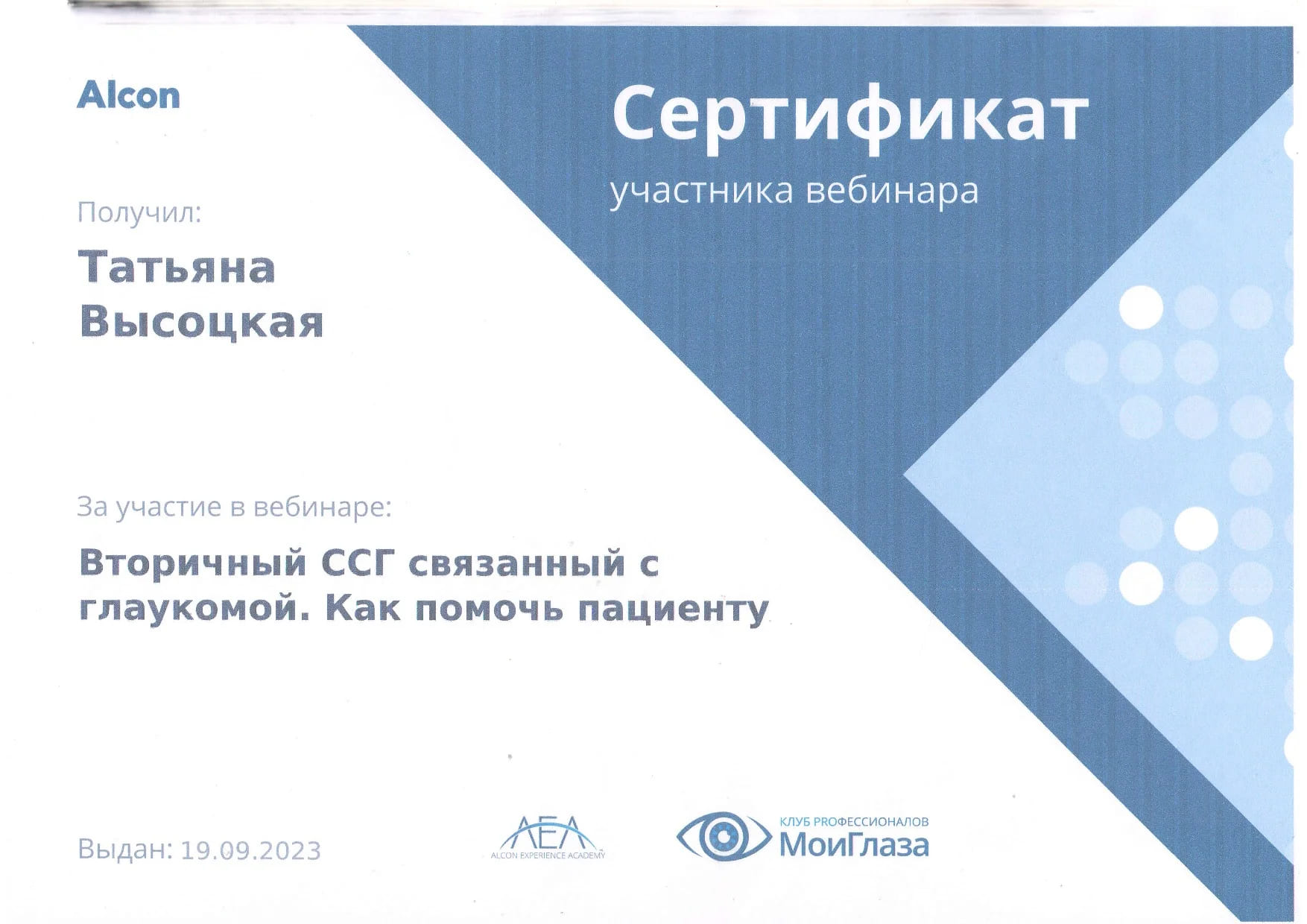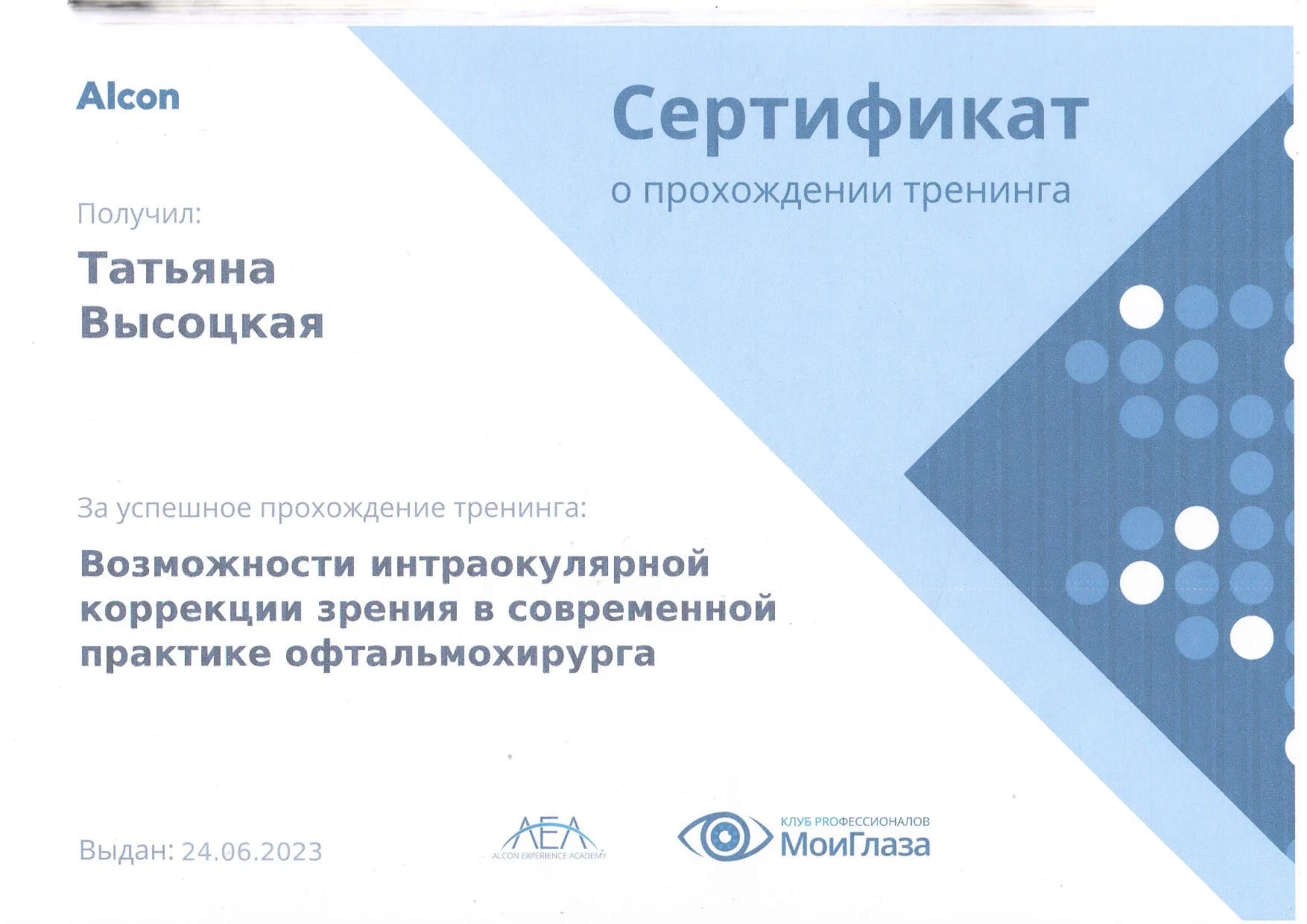 • 2023 г. — Присвоена высшая квалификационная категория по квалификации врач-офтальмолог.