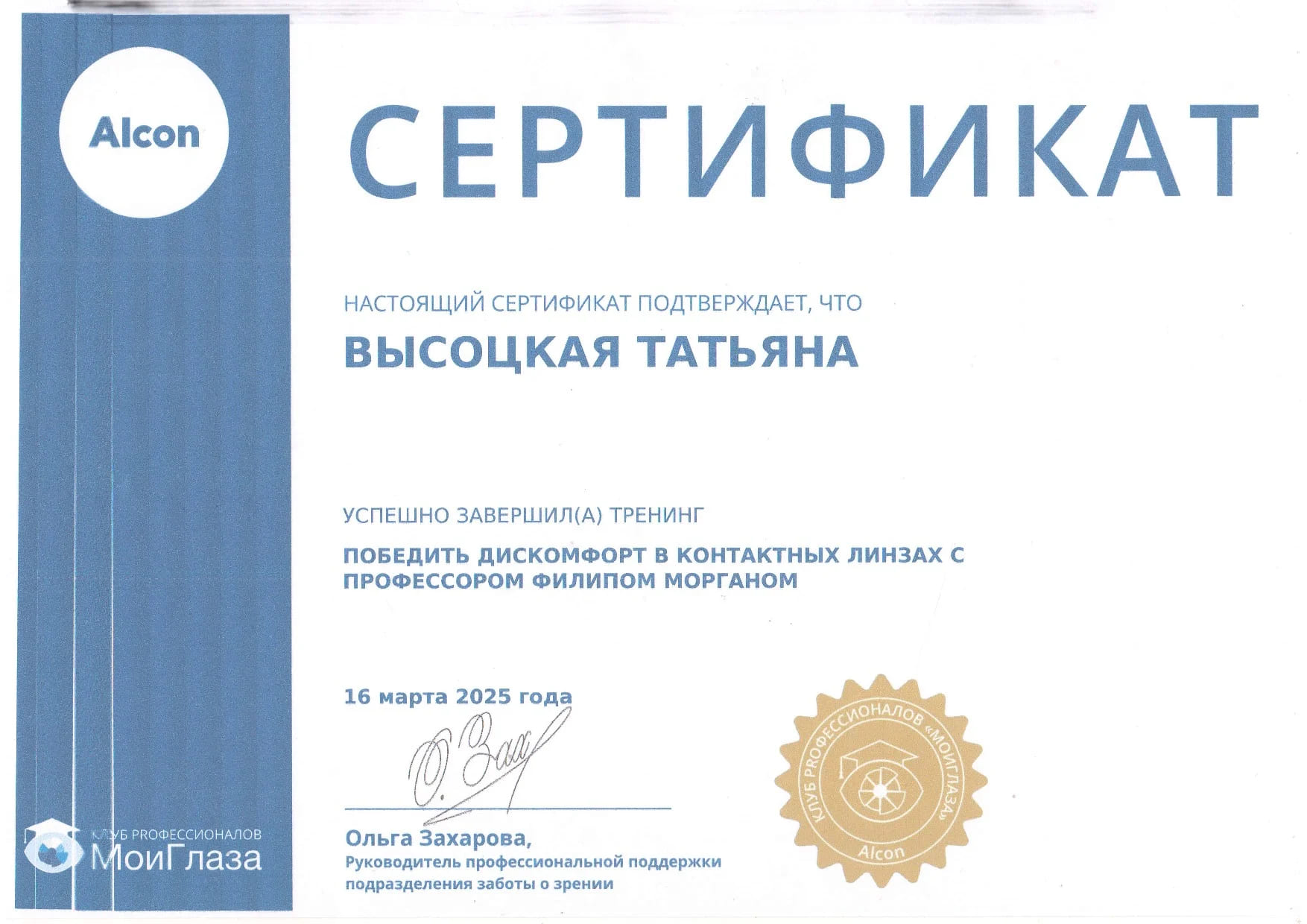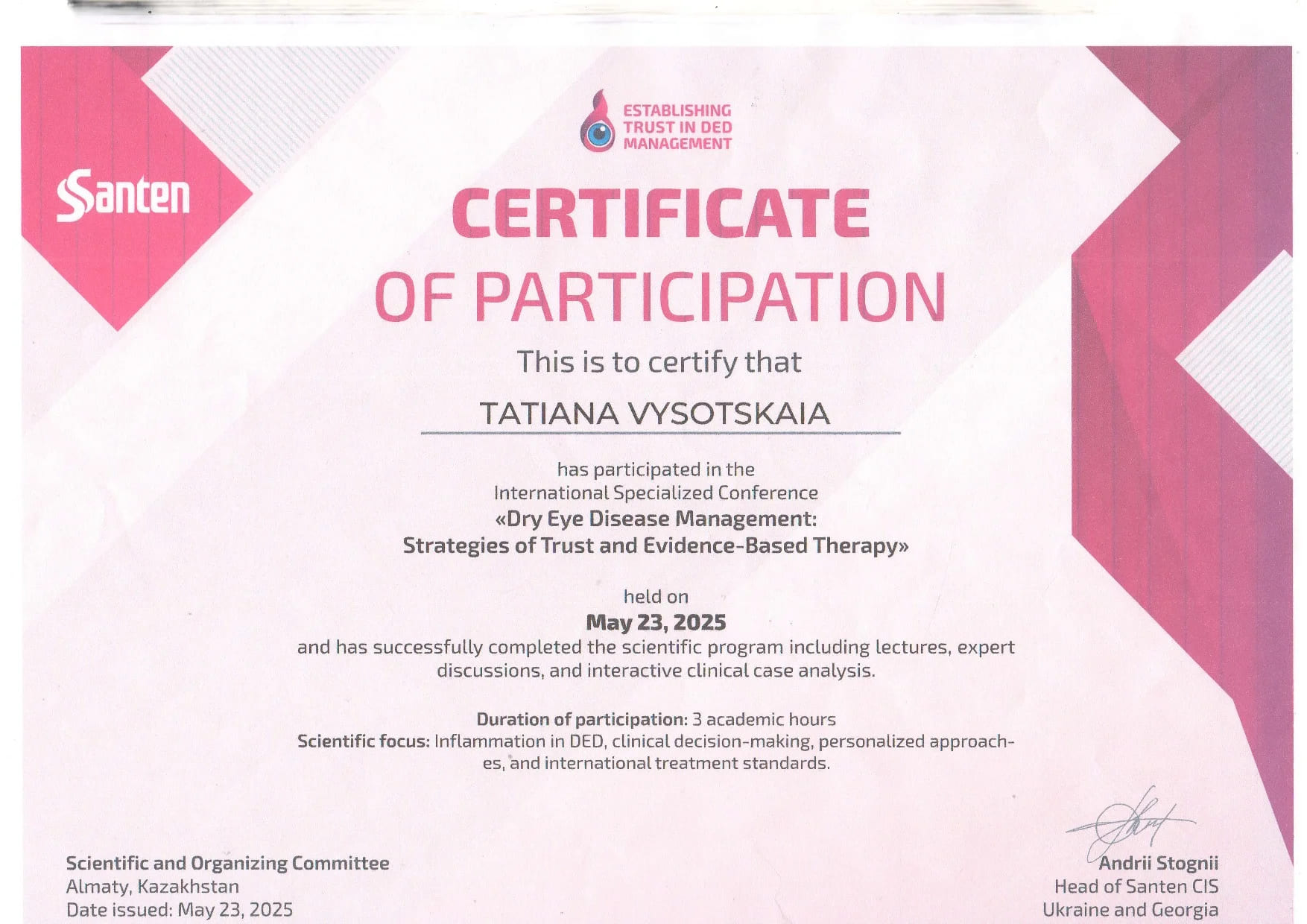 • 2025 г. — Завершила тренинг «Победить дискомфорт в контактных линзах с профессором Филипом Морганом».