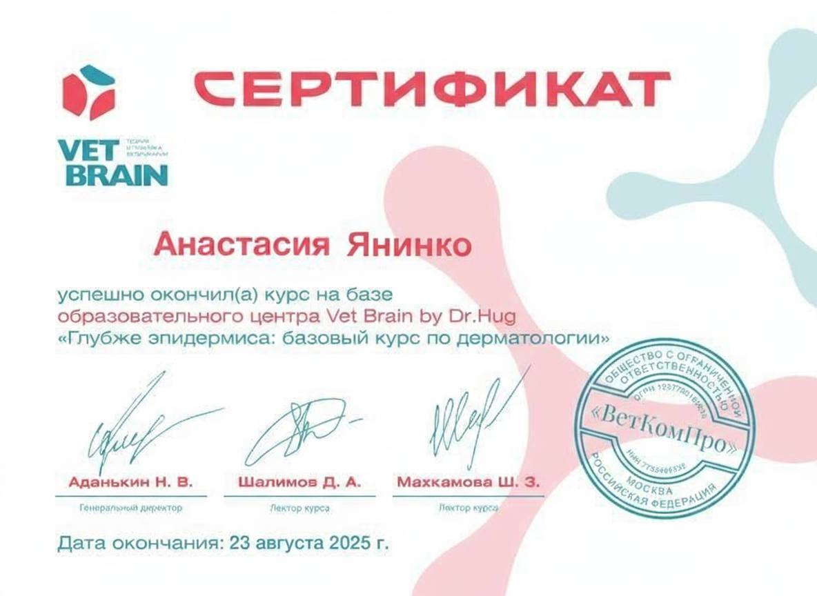 • 2025 г. — окончила онлайн-курс по дерматологии образовательного центра сети клиник Dr.Hug, г. Москва