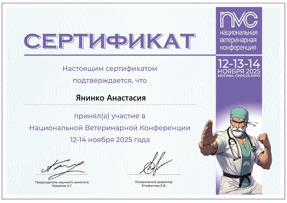 • 2024 г. — окончила УО Витебскую ордена «Знак почета» Академию Ветеринарной медицины, специализируюсь на терапии мелких домашних животных. Это включает в себя выполнение рекомендаций и послеоперационных назначений врачей центра