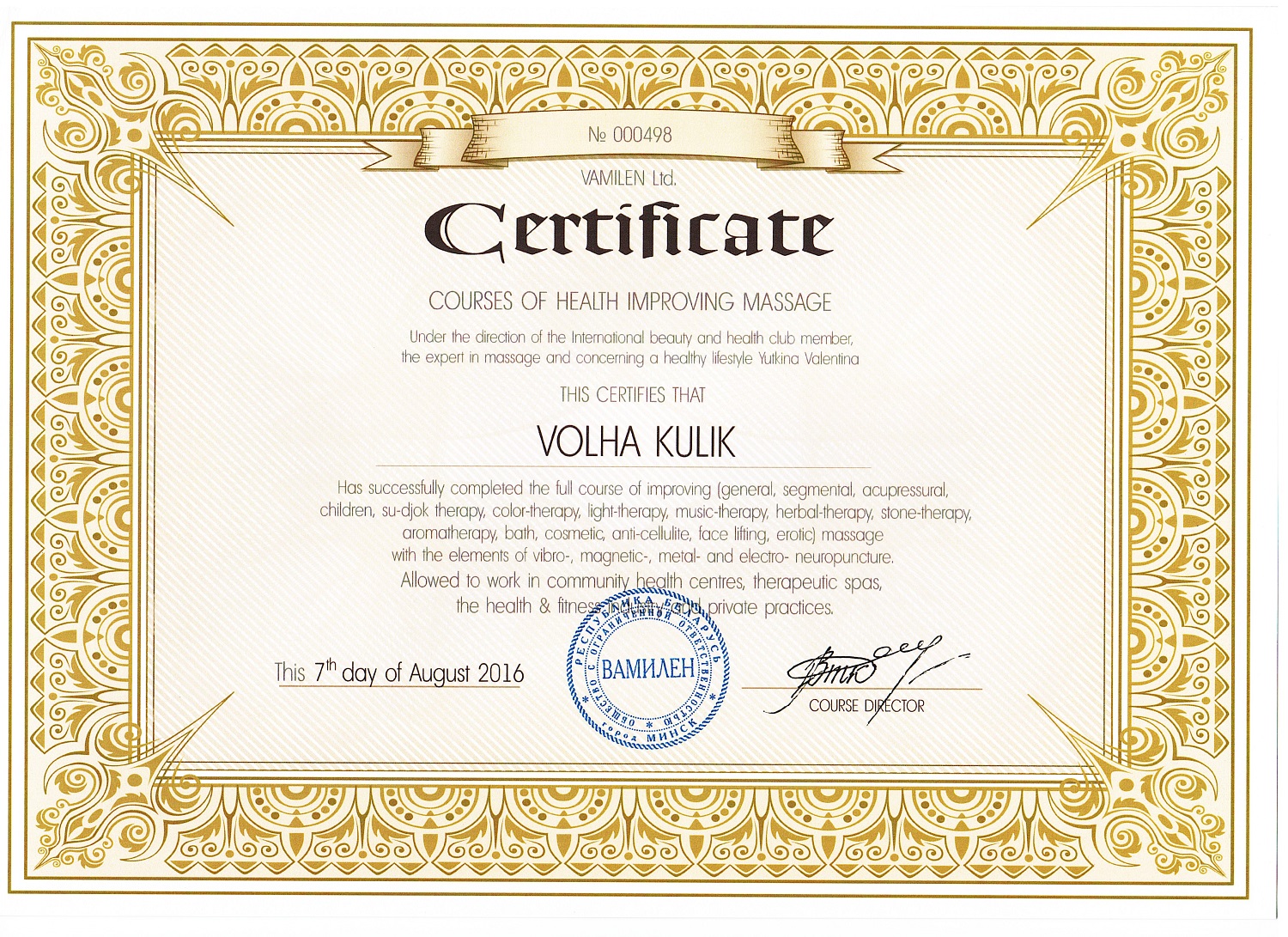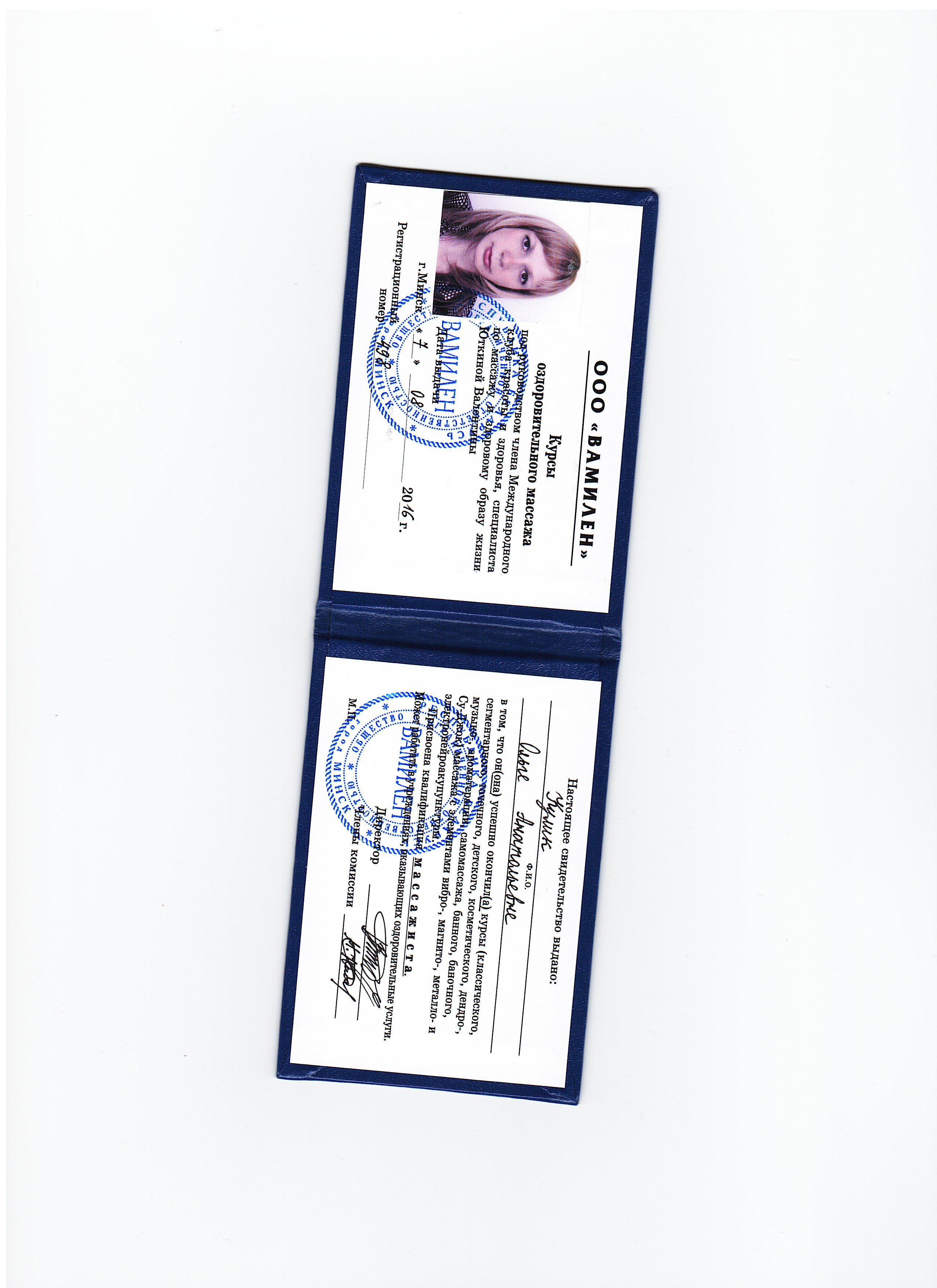 • август 2016 г. — курсы оздоровительного массажа под руководством Юткиной Валентины, ООО «Вамилен».