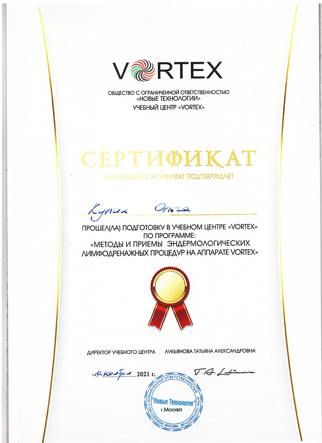 • ноябрь 2021 г. — курс «Методы и приемы эндермологических лимфодренажных процедур на аппарате Vortex», ООО «Новые технологии», г. Москва.