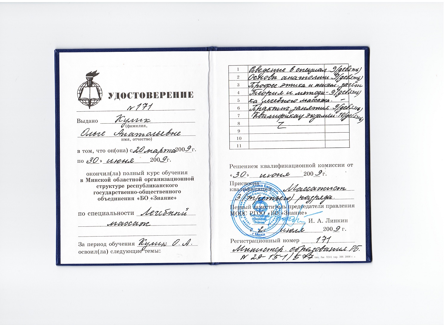 • июнь 2009 г. — полный курс «Лечебный массаж» с присвоением квалификации «Массажист 3-его разряда», БО «Знание».