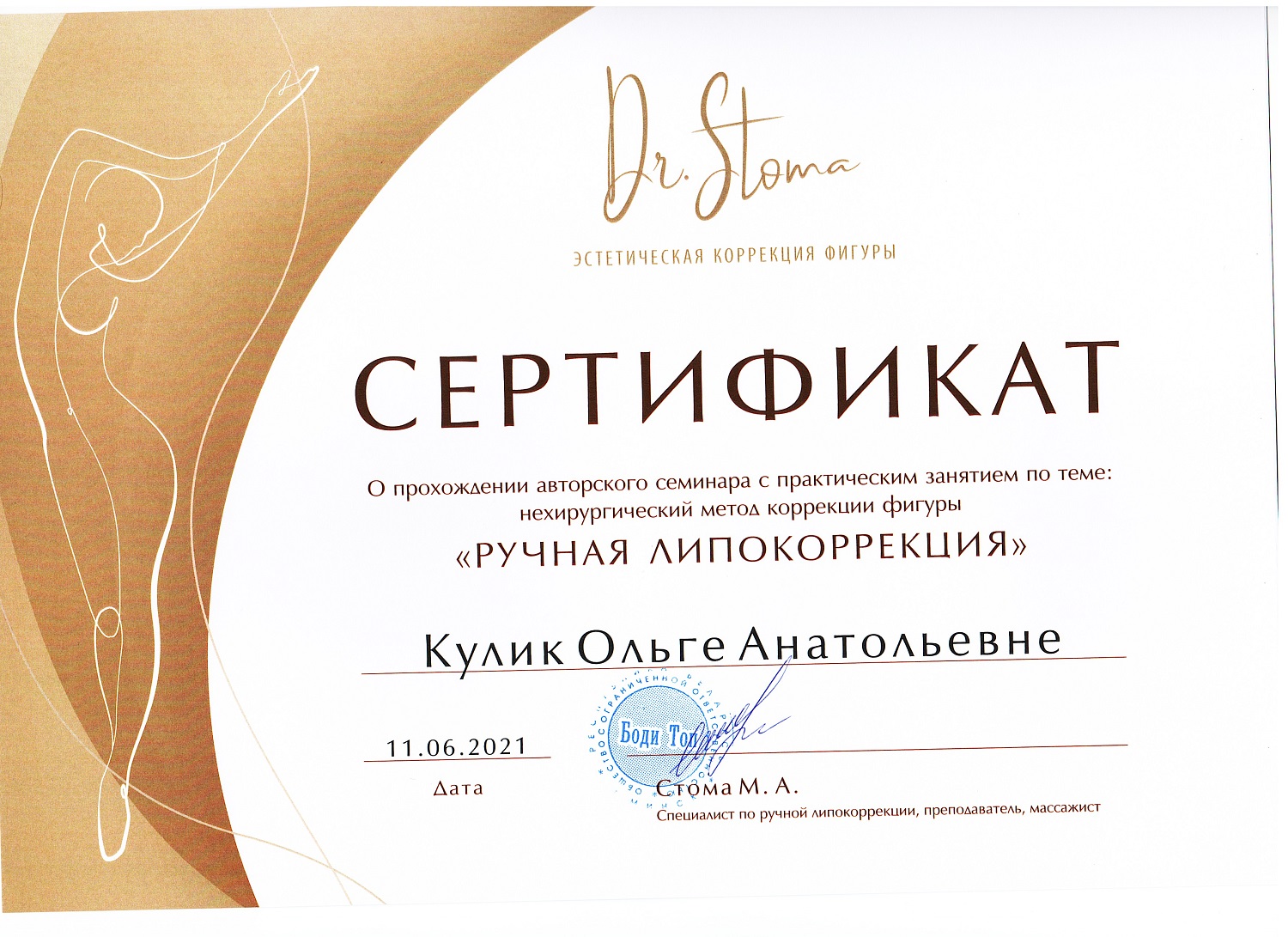• июнь 2021 г. — семинар с практическим занятием по теме: нехирургический метод коррекции фигуры «Ручная липокоррекция», центр эстетической коррекции фигуры Dr. Stoma.