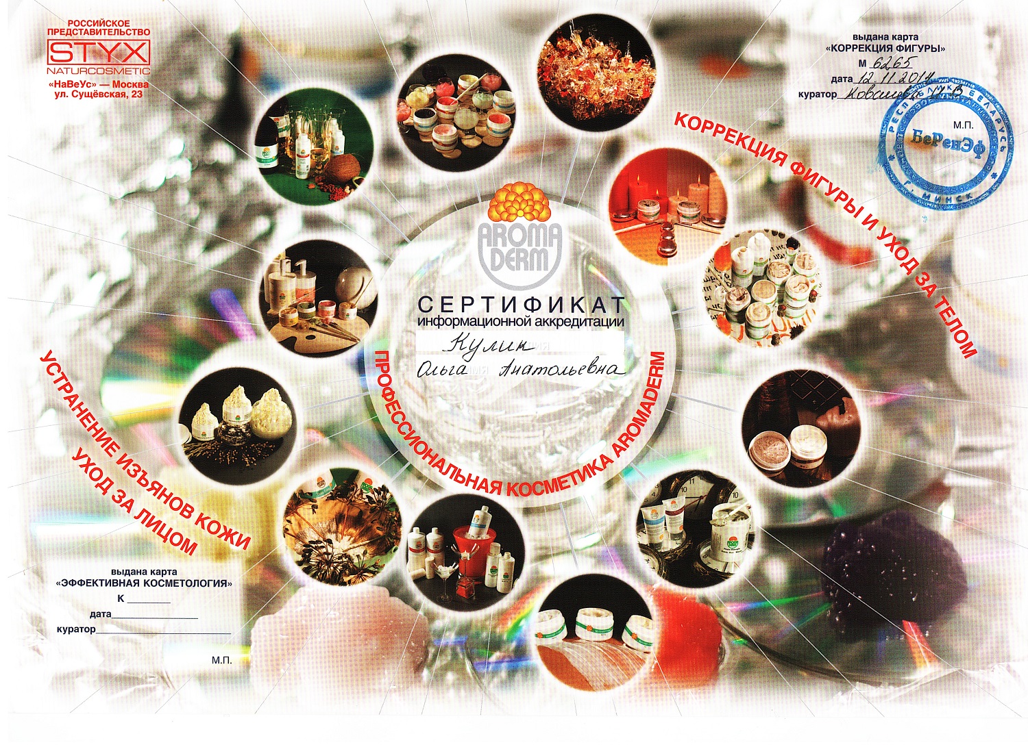 • ноябрь 2014 г. — сертификат информационной аккредитации «Профессиональная косметика Aromaderm».