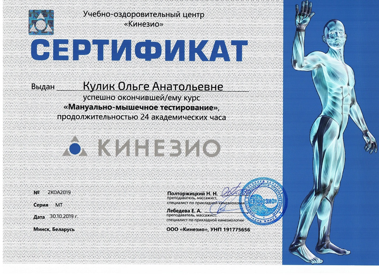 • октябрь 2019 г. — курс «Мануально-мышечное тестирование», 24 академ. часа, учебно-оздоровительный центр «Кинезио».