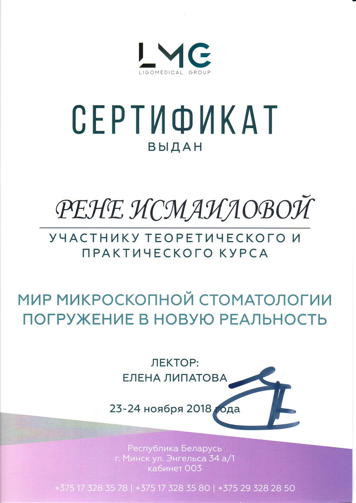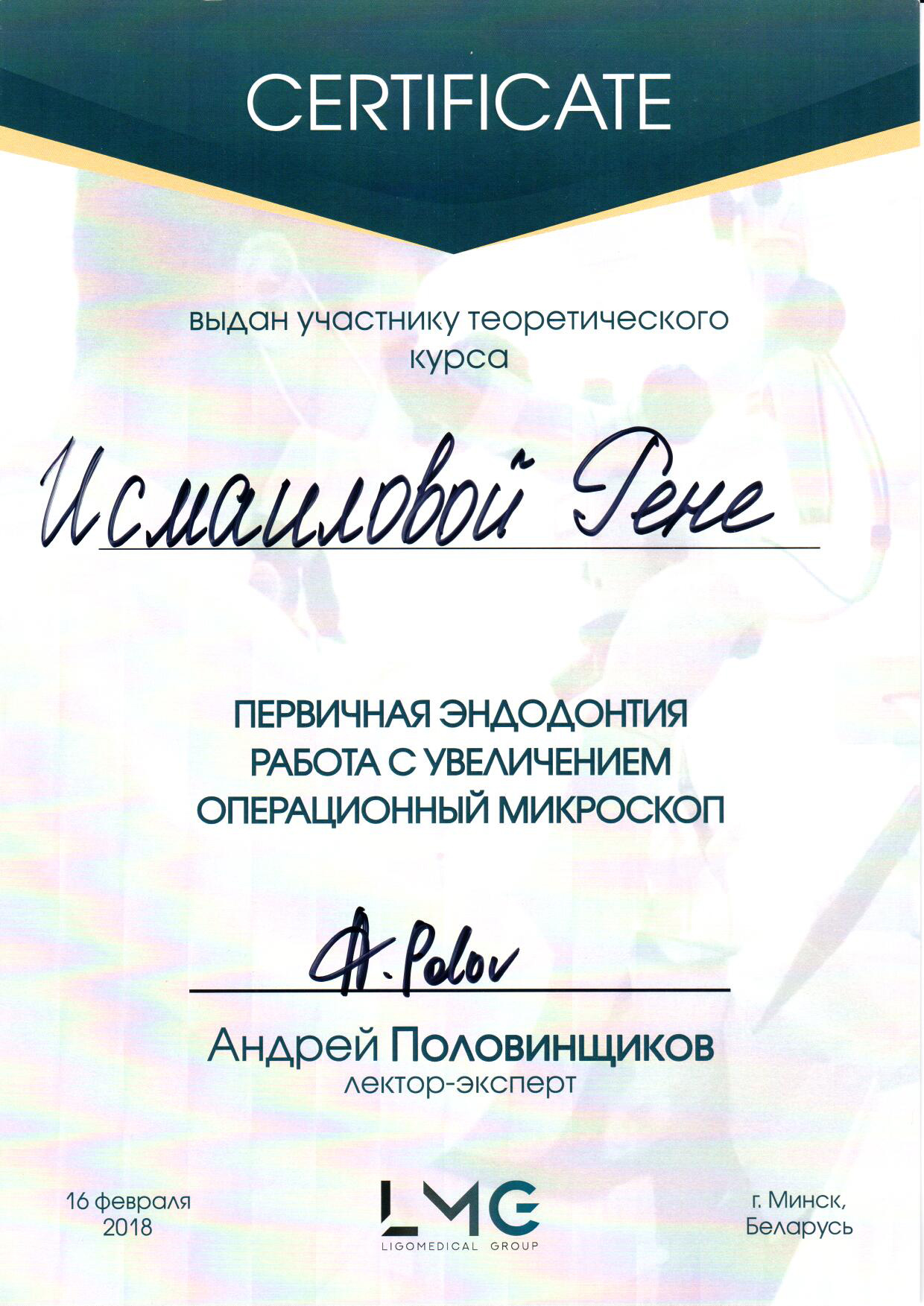 • Прошла теоретический курс первичной эндодонтии, работа с увеличением, операционный микроскоп, лектор-эксперт: Андрей Половинщиков;