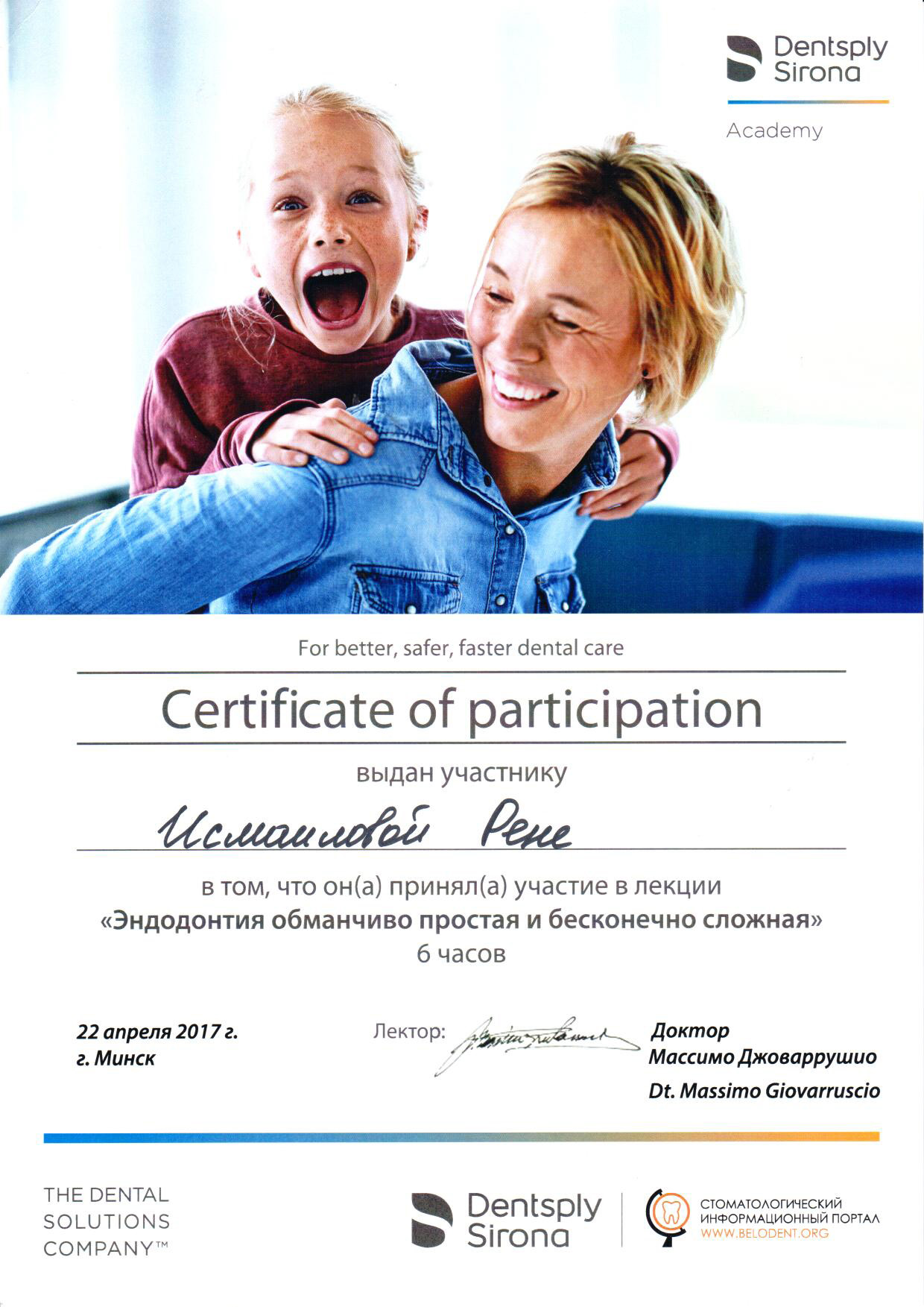 • 2016 г. — повышение квалификации по теме «Современные принципы эндодонтического лечения постоянных зубов», БелМАПО;