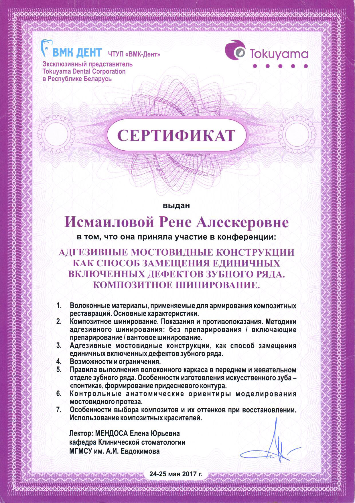• Прошла обучающий курс на тему «Адгезивные мостовидные конструкции», лектор: Ольга Пономаренко, Украина, Полтава.